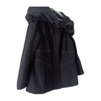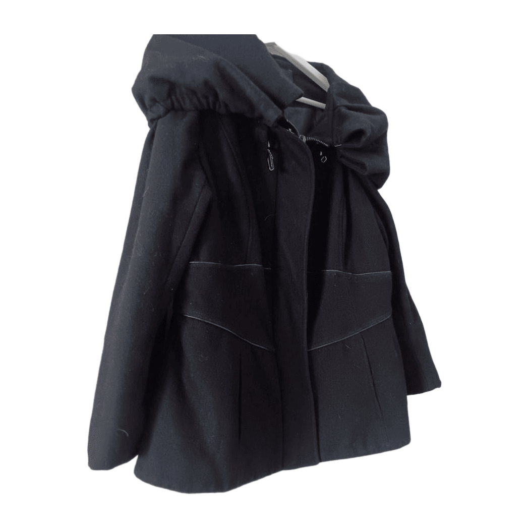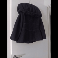 Muotoiltu, tyylikäs takki. Todella iso huppu. Lyhyt malli. Vyötäröltä kapea malli.