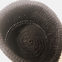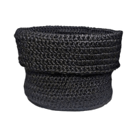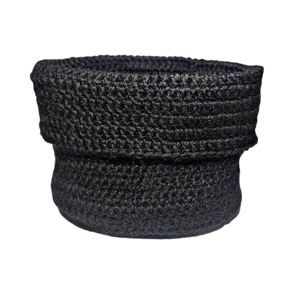 Musta kori pientavaralle (esim. korut, kynsilakat). Pohjan halkaisija n. 12 cm. Korkeus kuvan mukaisesti reuna taitettuna hitusen yli 10cm. Reunan pystyy taittamaan mistä kohdasta haluaa eli koria saa säädettyä myös korkeammaksi tai matalammaksi.