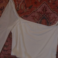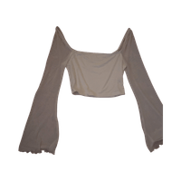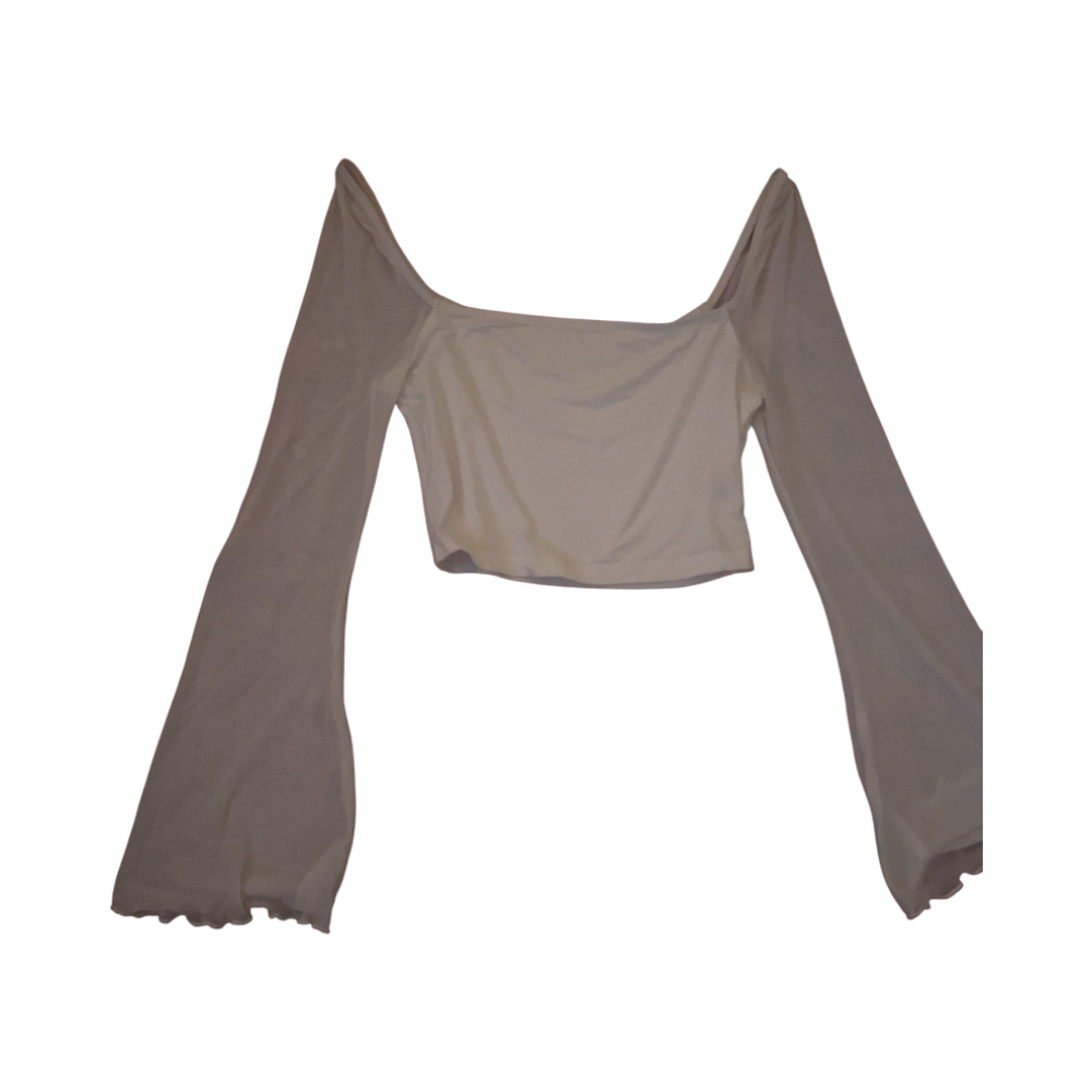 Off-shoulder lyhyt toppi läpikuultavilla liehuvilla hihoilla.