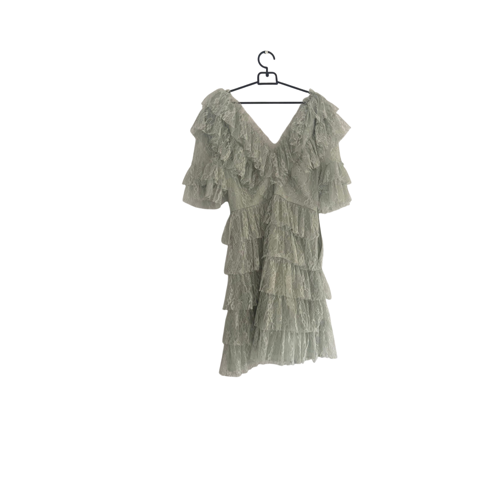 Vihreä röyhelöpitsinen juhlamekko, lyhyt malli.