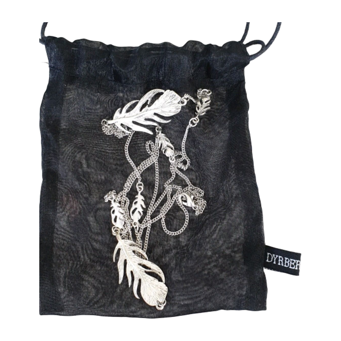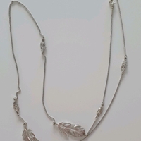 KOODILLA MH2442 ILMAINEN POSTITUS! Kaunis hopeinen kaulakoru, jossa hopeisia höyheniä. Ketjun kokonaispituus 96cm.