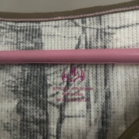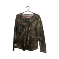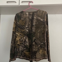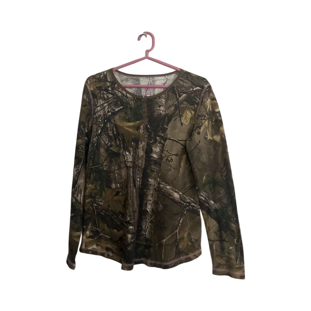Pitkähihainen camo-paita, ribbineulos, painonapit edessä.