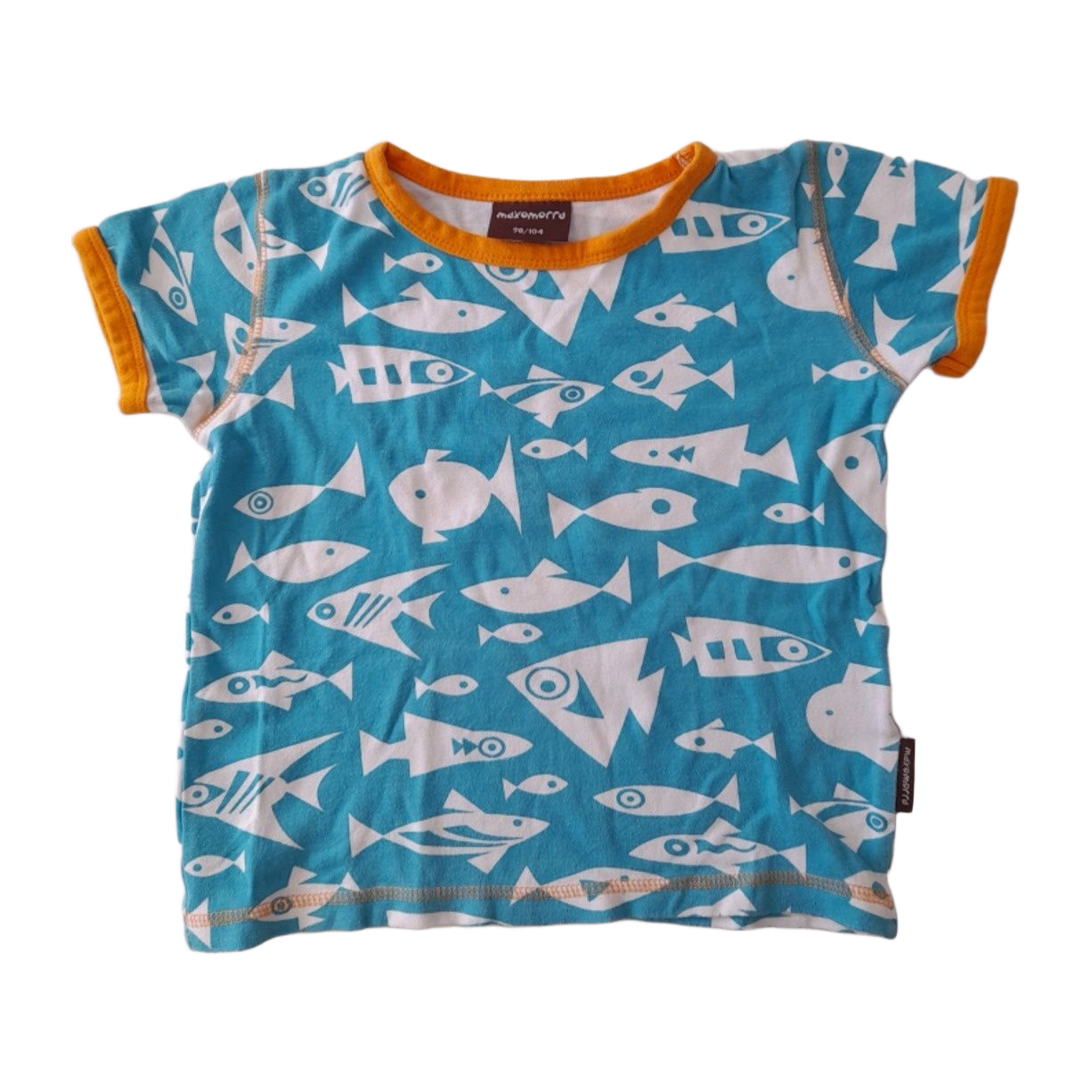 Maxomorra-merkkinen lyhythihainen t-paita. Koko 98/104. Käytetty, ei nimikoitu. Pesunukkaa. Mielestäni malliltaan lyhyt leveyteensä nähden (tai leveä pituuteensa nähden).