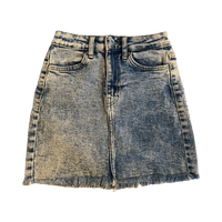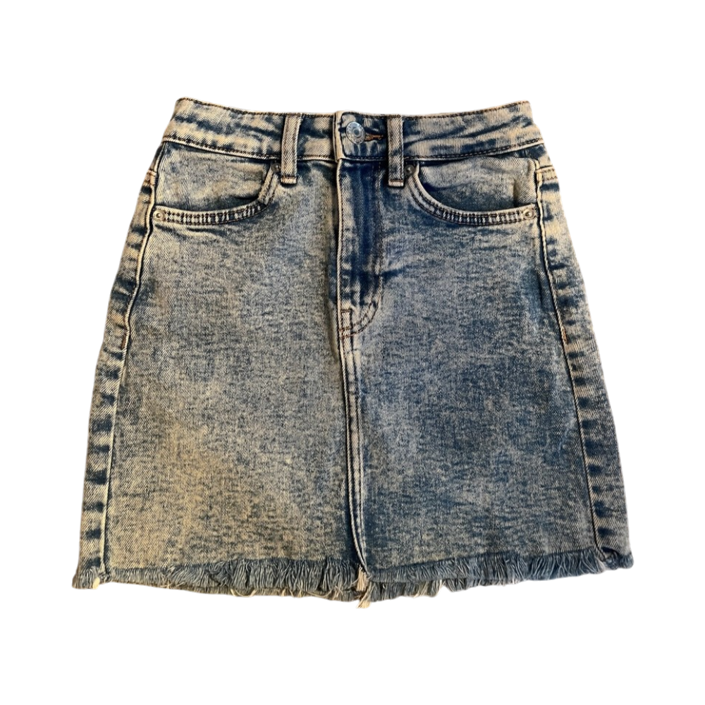Lyhyt farkkuhame keskikorkealla vyötäröllä, fringeraita helmassa.