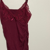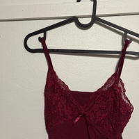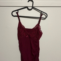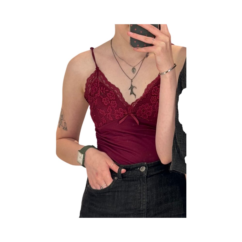 Burgundy lace-trim fitted camisole, adjustable thin straps.