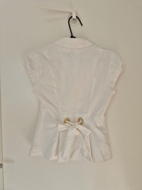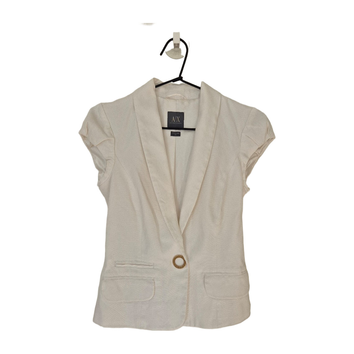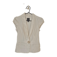 Valkoinen lyhythihainen bleiseri, yhdellä nepparilla, pienillä taskuilla sekä koristevyötärönauhalla.