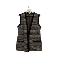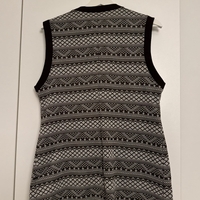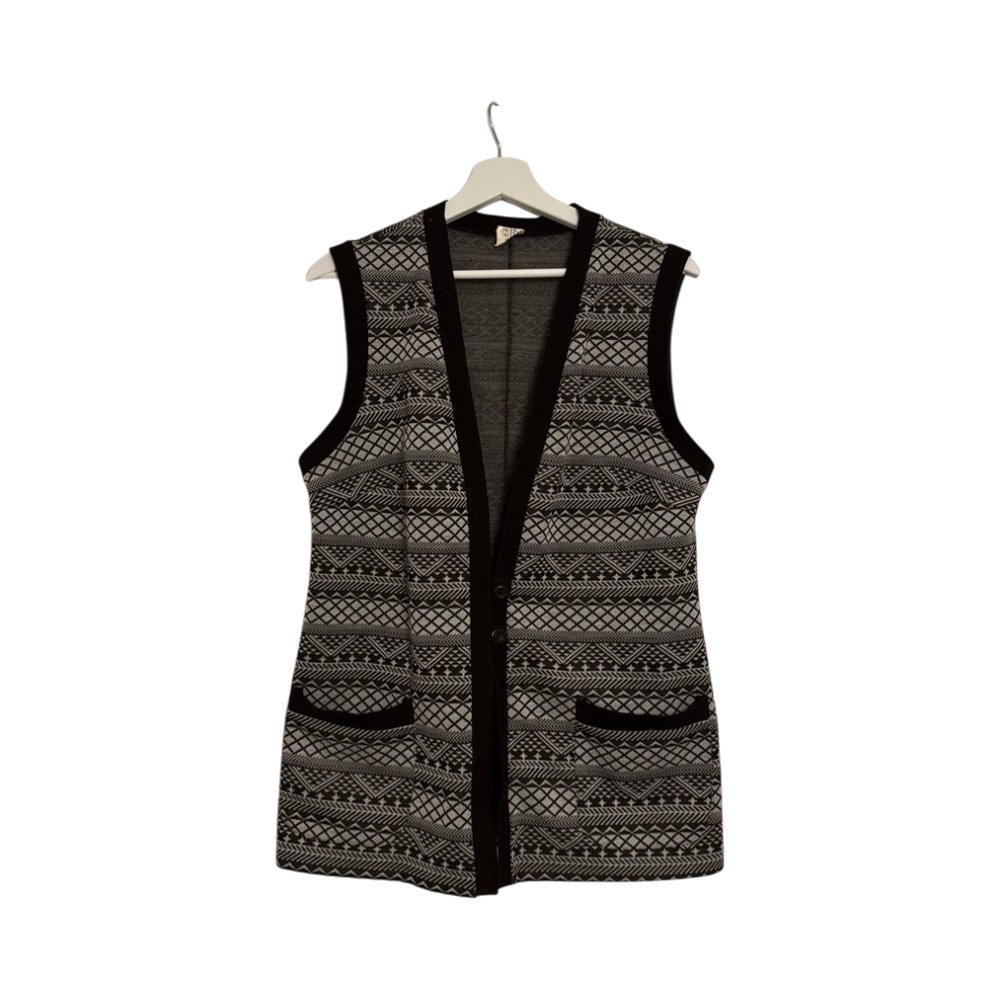 Pitkä neuleliivi, napit ja etutaskut, kuvioitu.