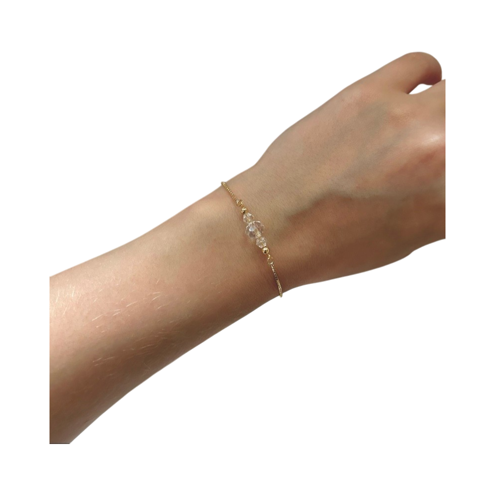 Käsintehty rannekoru lasihelmillä. Saatavilla sekä hopeisena että kultaisena. Säädettävä pituus. Yhteensopivia korvakoruja myös saatavilla.