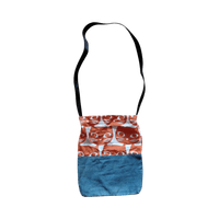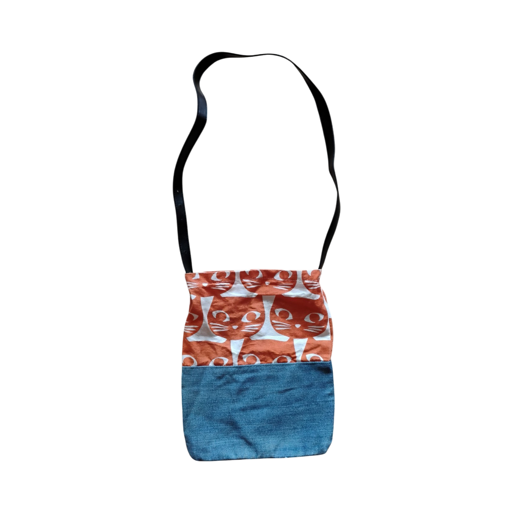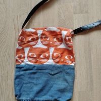 Kissa-laukku farkkualaosalla ja nahkahihnalla. Koko n. 30 x 23 cm. Ei ole vetoketju tms. kiinnitysmekanismia.