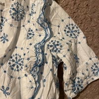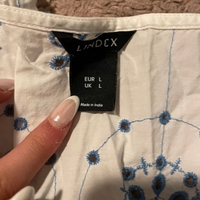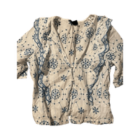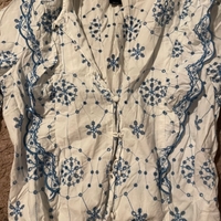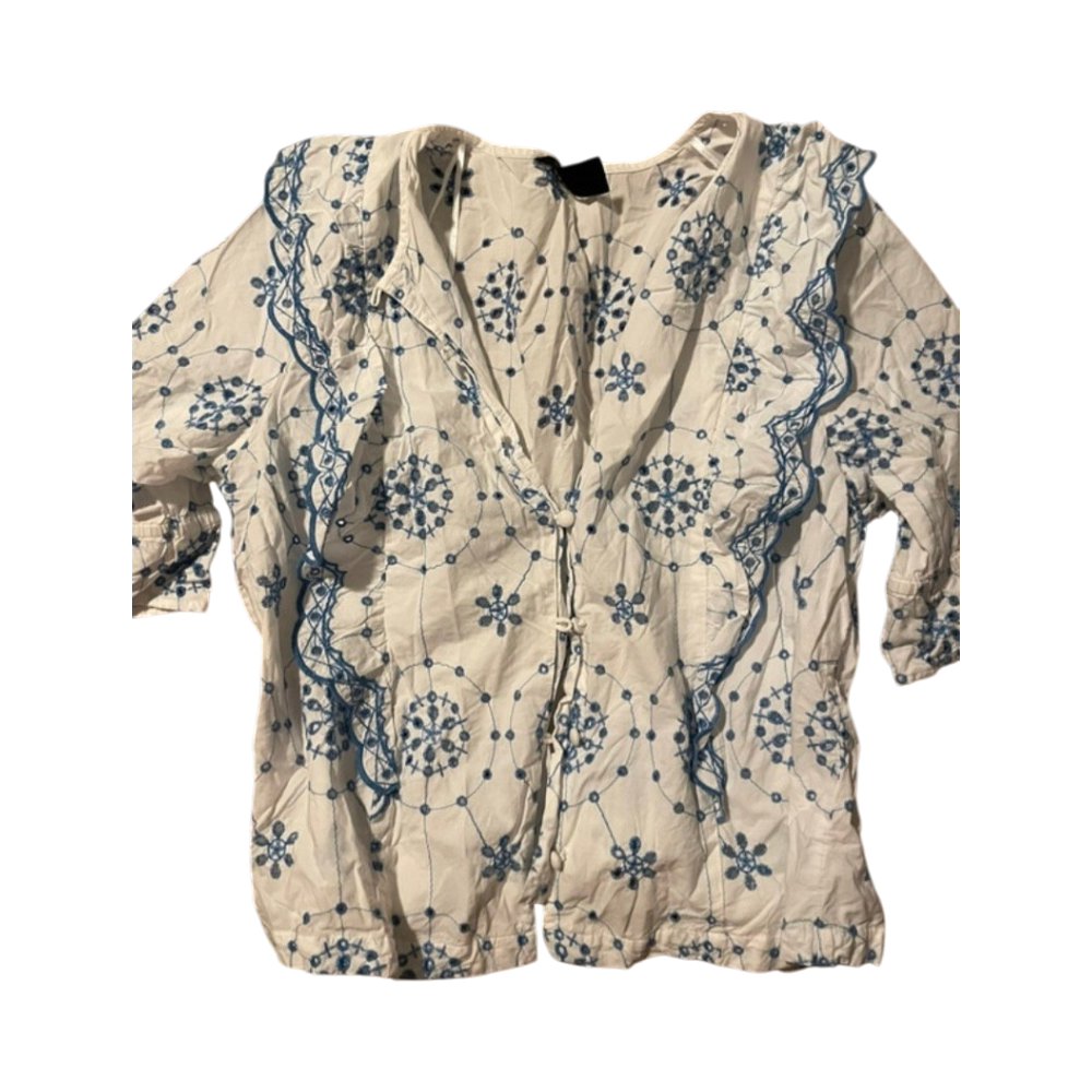 Valkea pusero sinisellä kirjonnalla, v-muotoisella kaula-aukolla ja pienillä napeilla! 😍
