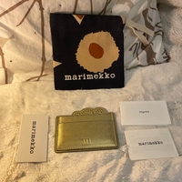Käyttämätön Marimekon Unikko Imprint kullanvärinen korttikotelo. Pituus 10.5 cm, leveys 0.5 cm, korkeus 8 cm. Pintamateriaali nahka. Kuvassa näkyvä Marimekon pussukka tulee mukaan.
