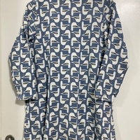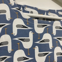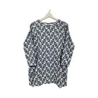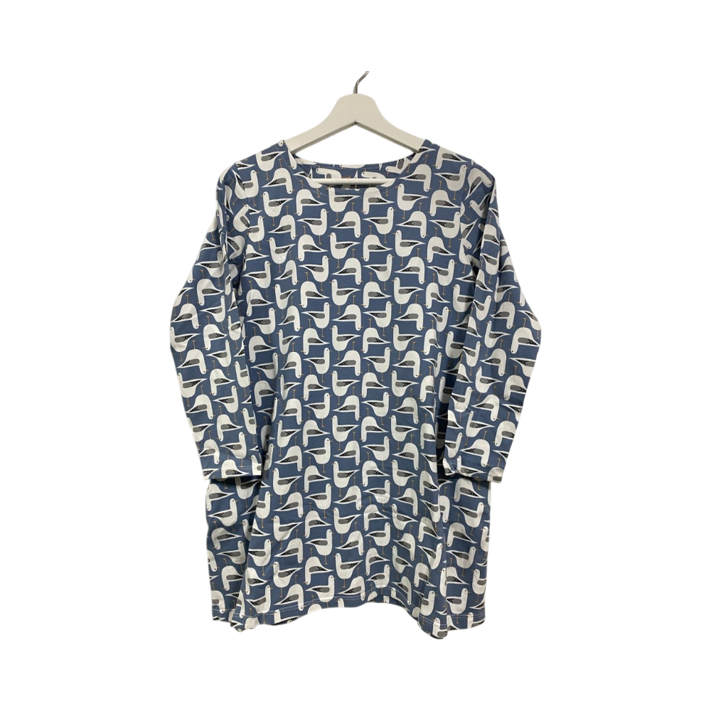 Söpö pitkähihainen A-linja itsetehty lokki-kuvionen tunika / pyjamapaita / yömekko kahdella sivutaskulla. Se on edellisen omistajan itse tekemä/ommellut, hyvässä kunnossa. Sileää ja melko joustavaa kangasta, mukava iholla.