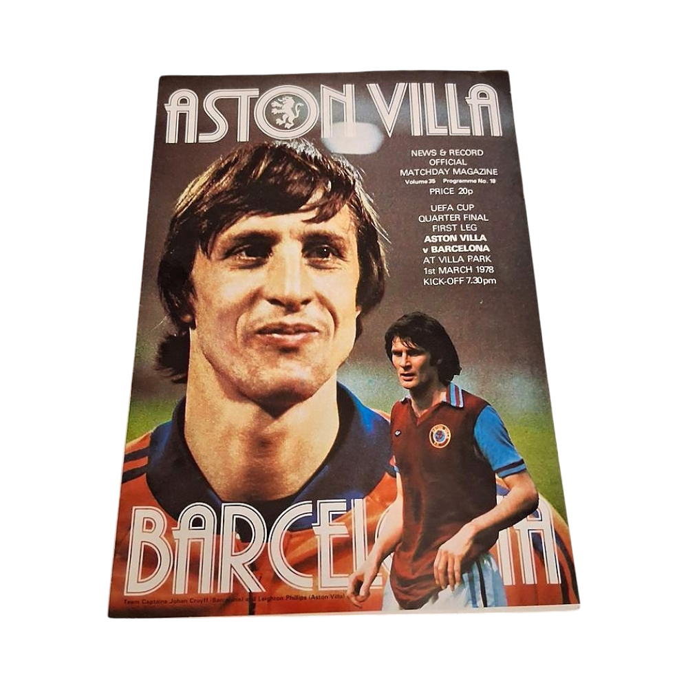 Todellinen kansainvälinen harvinaisuus! Tämä on alkuperäinen otteluohjelma historiallisesta Eurooppa-pelistä Aston Villa vs. FC Barcelona, joka pelattiin 1. maaliskuuta 1978. Eurooppa-kohtaamisten ohjelmat ovat keräilijöiden suosikkeja!
