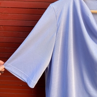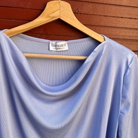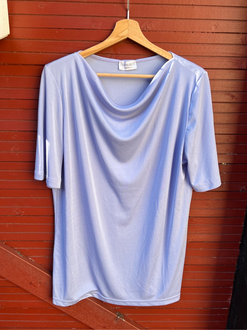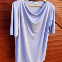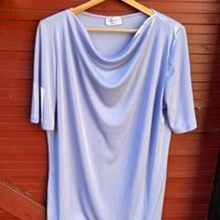 Pusero kauniisti laskeutuvalla kauluksella. Koko M, menee myös ainakin L. Laventelinvärinen. Mukava, joustava materiaali. Olkatoppaukset.