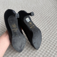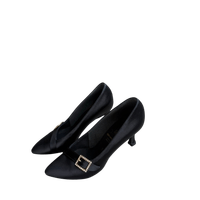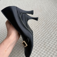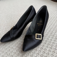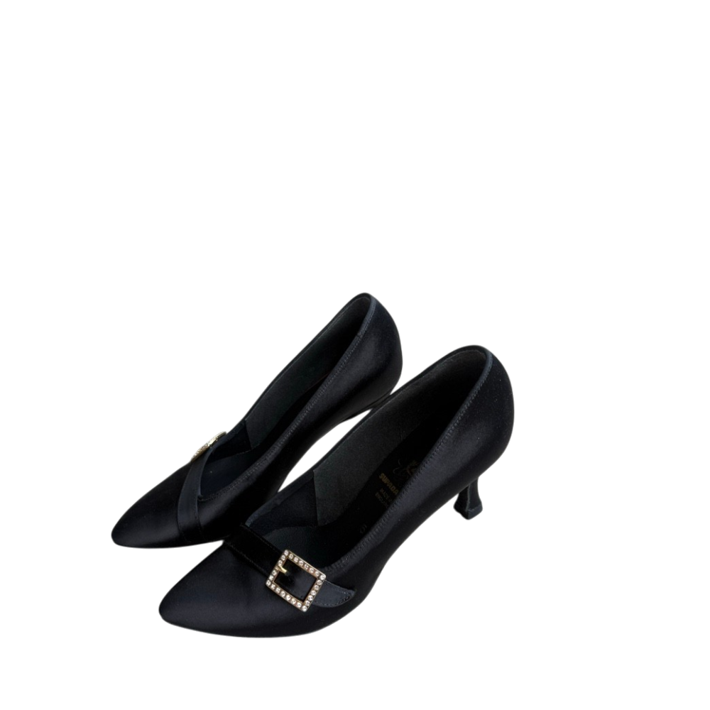 Mustat satiinipintaiset korkokengät, koristeellinen timanttisolki. Koko 5, eli 37,5/38. Made in England. Korko 7 cm. Käytetty omissa vanhojentansseissa.