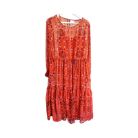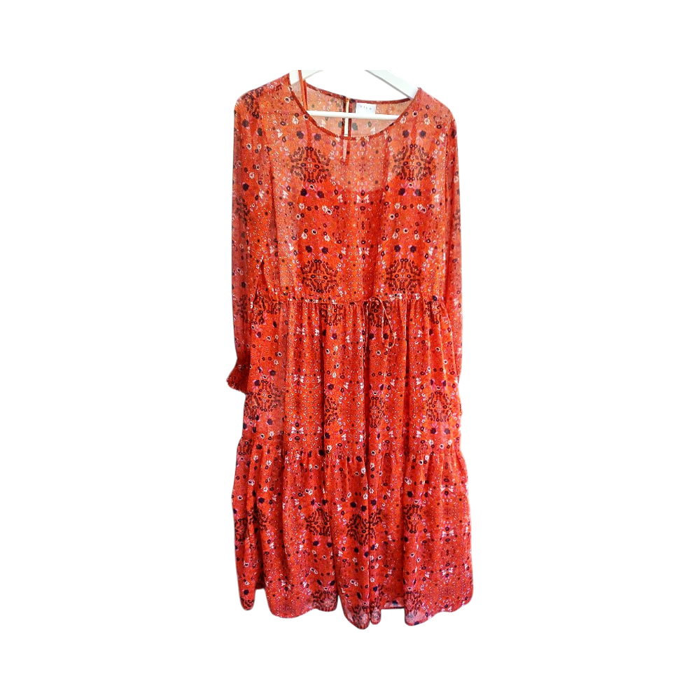 Punaoranssi kukkamekko pitkähihainen, kukkakuosi, vyötärönauha. Koko 38 eli M. Mielestäni reilua mitoitusta mahtuu myös minulle joka olen kokoa L. Kainalo-kainalo n.50cm ja kangas ei jousta. Mekossa on alusmekko.
