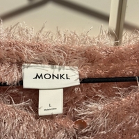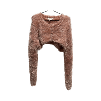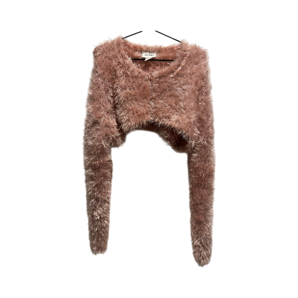 Shaggy fuzzy cropped cardigan with long sleeves, soft fluffy texture.