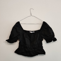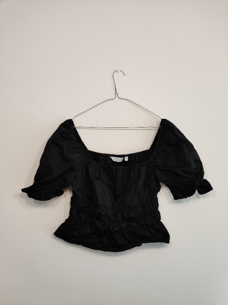 Smocked waist, square neckline, short puff sleeves, lightweight blouse. Used few times.