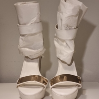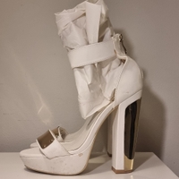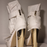 Valkoiset korkkarit kultaisilla yksityiskohdilla. Teknonahkassa pientä halkeamaa. Metalliosissa takapuolella pientä naarmua. Olleet ulkokäytössä.