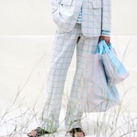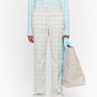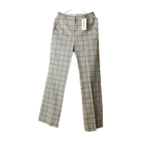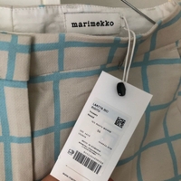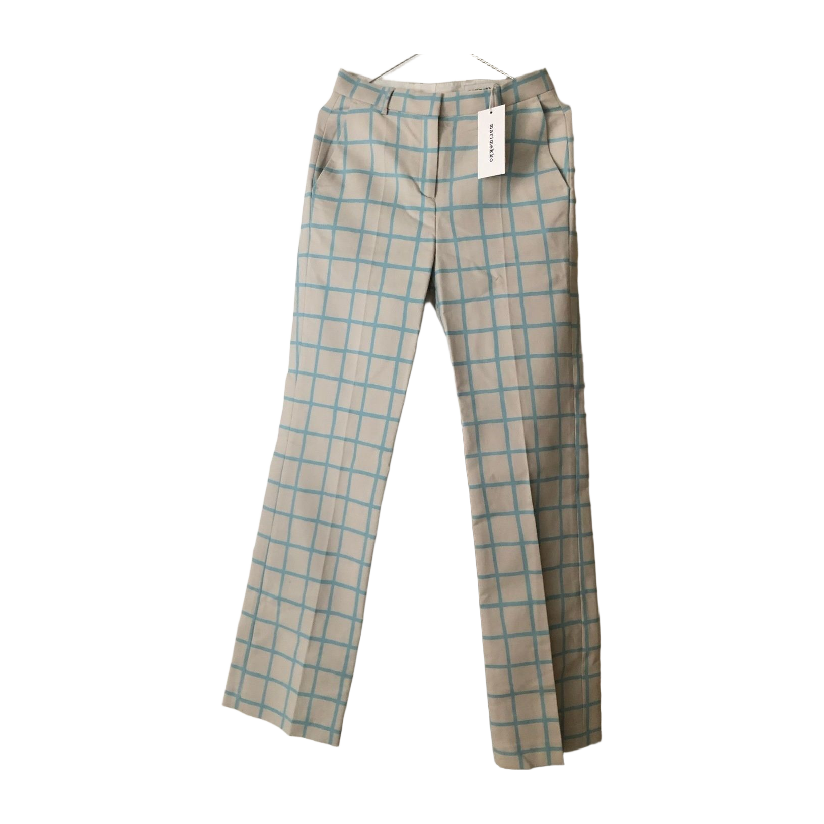 Marimekon uudet Laatta Iso Ruutu -housut koossa 34. Väri: harmahtava(?) luonnonvalkoinen ja vaaleansininen/turkoosi.