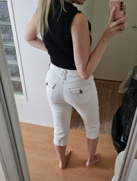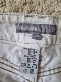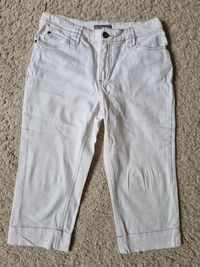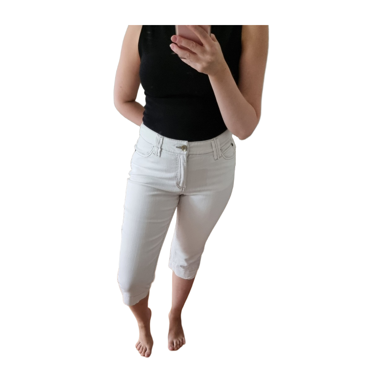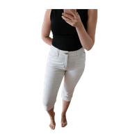Valkoiset farkkukankaiset caprit. Koko 38. Lahkeet ehkä hyvin haaleasti värjäytyneet, mutta ei näy käytössä.