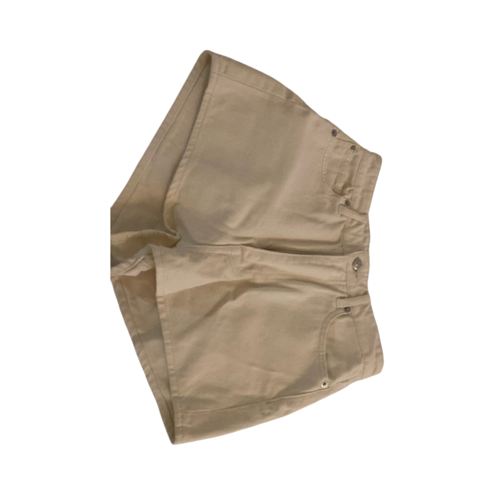 Beiget korkeavyötäröiset farkkushortsit, lyhyt lahje.