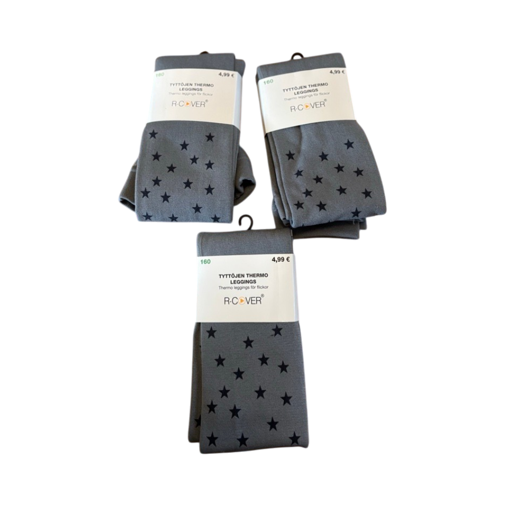 Harmaat leggingsit mustilla tähdillä, joustava vyötärö, mukavat päällä.