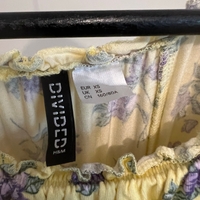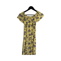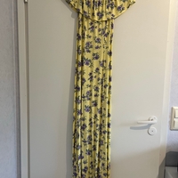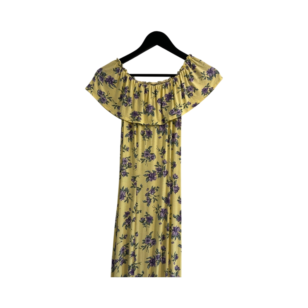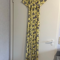 Off-shoulder pitkä kukkamekko, keltainen pohja ja violetteja kukkia.