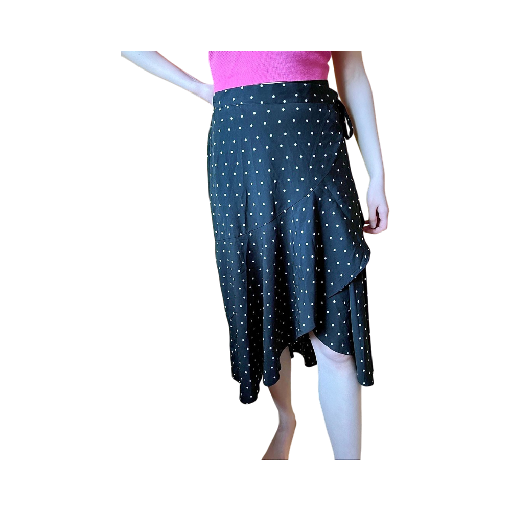 Mustavalkoinen Lindexin kietaisuhame söpöllä pallokuosilla. Helmassa röyhelöä. Ihanan kevyt päällä eikä mene ryppyyn!