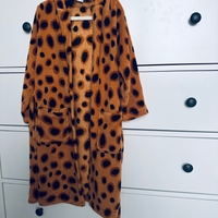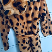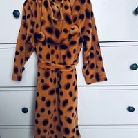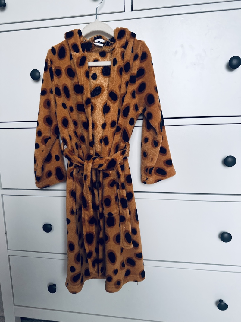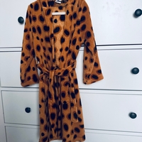 Pehmeä, fleece-tyylinen aamutakki vyöllä ja huppulla.