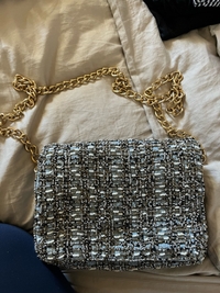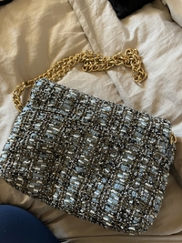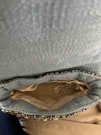 Sininen olkalaukku helmikoristeilla ja kultaisella ketjulla. Voi käyttää olanyli tai laittaa hihna laukun sisällä ja ”clutchina”. Käytetty vain muutamia kerran, joten hyvässä kunnossa.