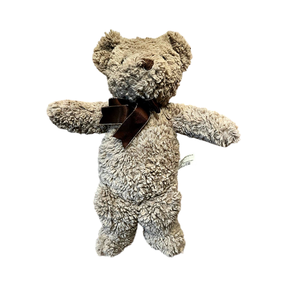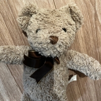 Nalle pehmolelu jolla ruskea rusetti kaulassa.