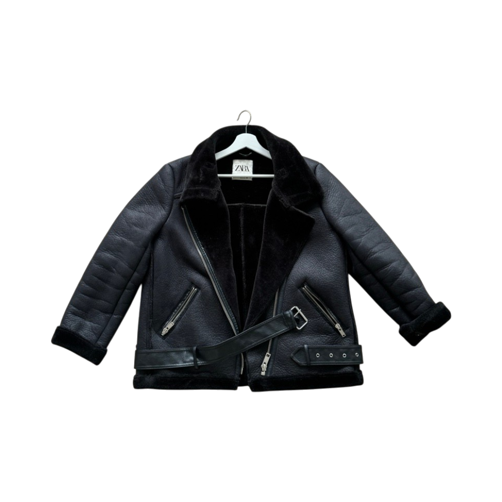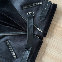 Musta biker-tyylinen karvatettu talvitakki, vyöllä ja vetoketjuilla. Koko Xl, vastaa L.