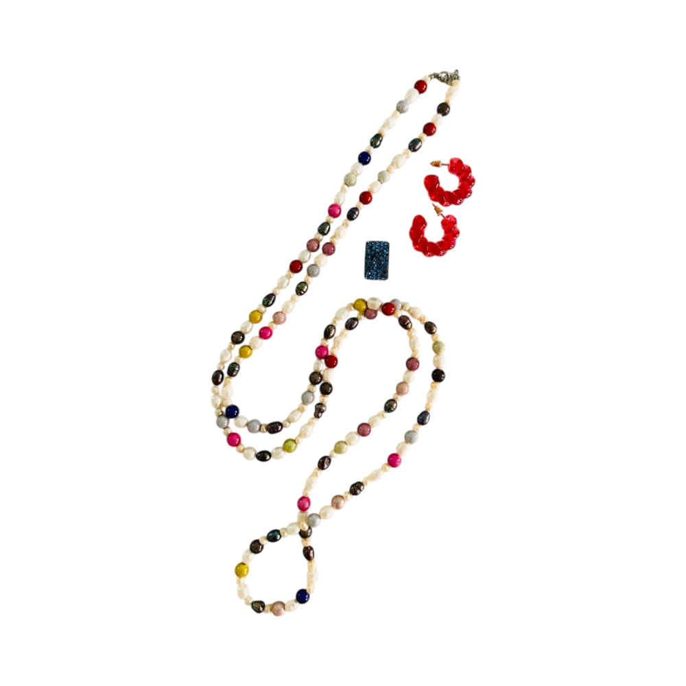 Helmistä ja värillisistä helmiäisistä valmistettu kaulanauha, sormus sinisillä kivillä ja korvakorut sävysävyyn punaista