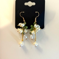 Kultasävyiset roikkuvat korvakorut valkoisilla helmillä ja kukilla.