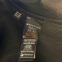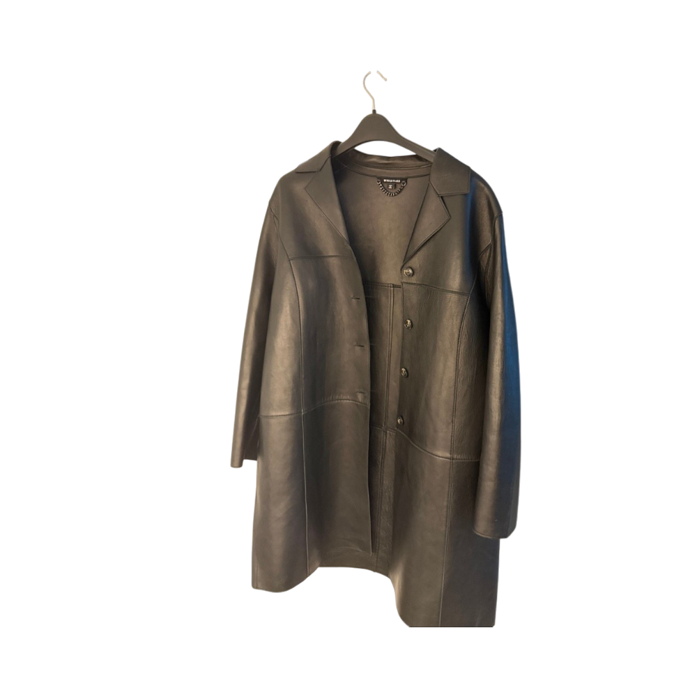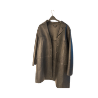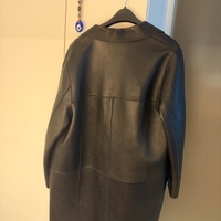 Long black shearling leather coat, button front, oversized fit.