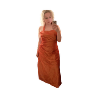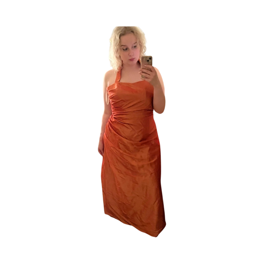Pitkä oranssi juhlamekko, olkaimellinen ja laskostettu vyötärö.
