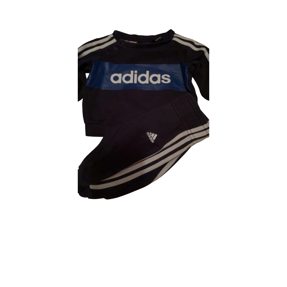 Kids navy adidas tracksuit with logo and three stripes.