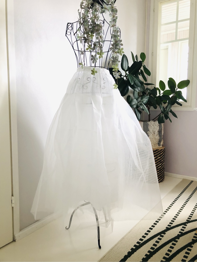 4 kerrosta tylliä ja alin kerros polyesteria yms.