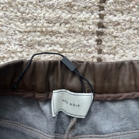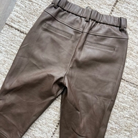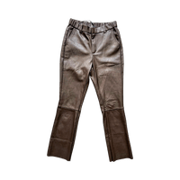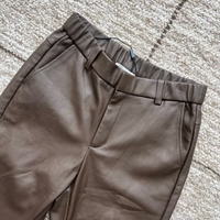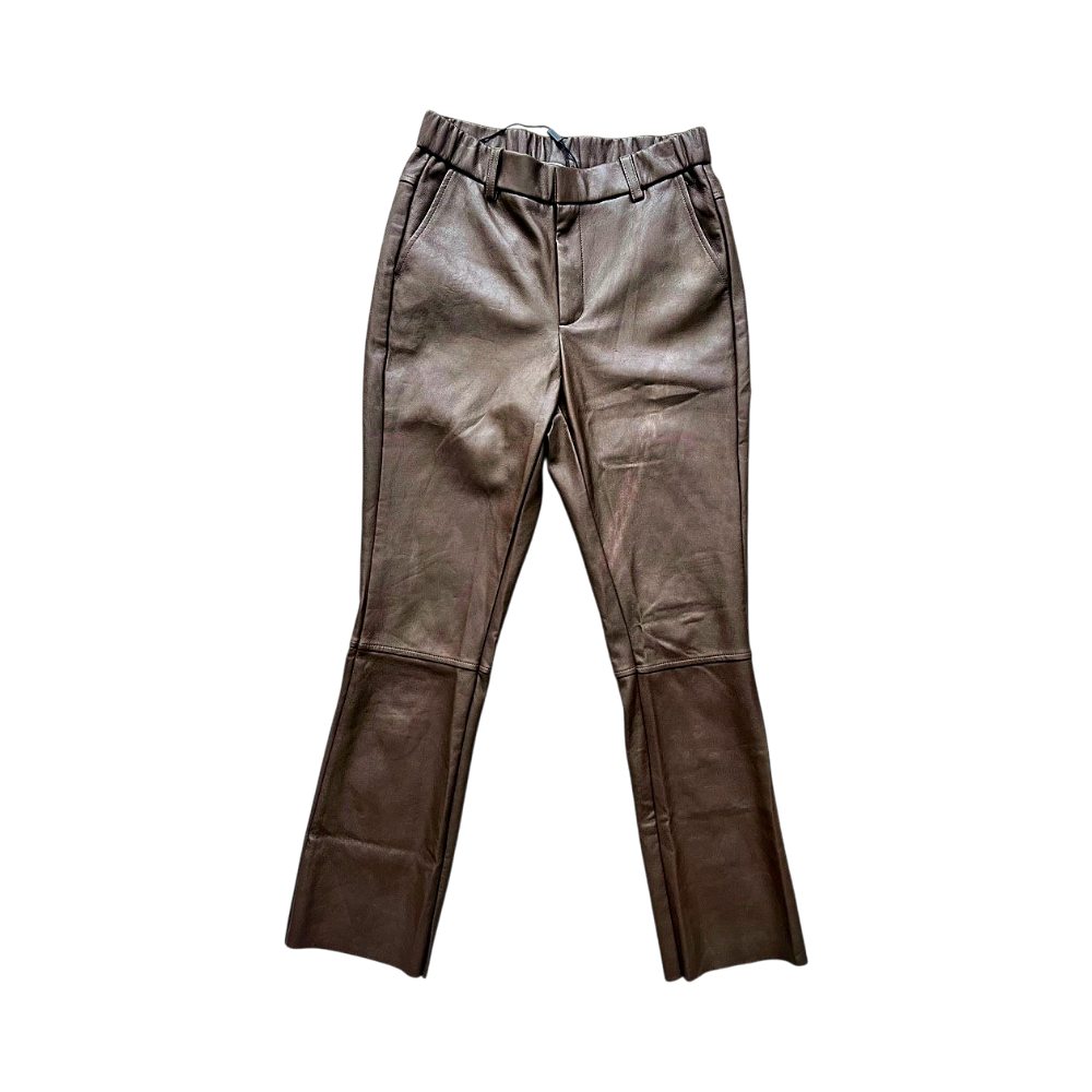Siistikuntoiset tekonahkahousut, levenevät lahkeet. Koko s, lahkeen sisämitta 71cm ja vyötärönympärys venyttämättä 66cm