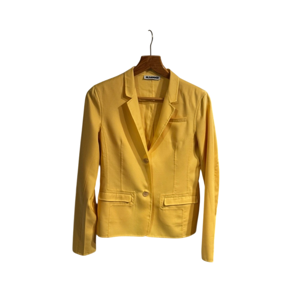 Bright yellow single-breasted tailored blazer, two-button, flap pockets.