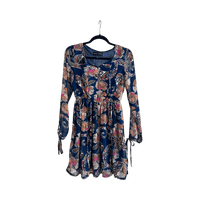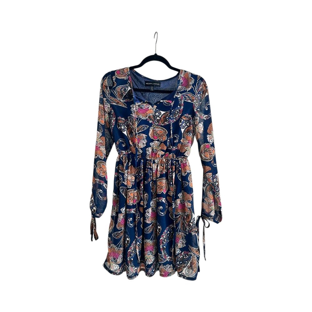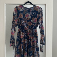 Pitkähihainen kuviollinen mekko. Hihassa solmittavat nauhat, joustava vyötärö