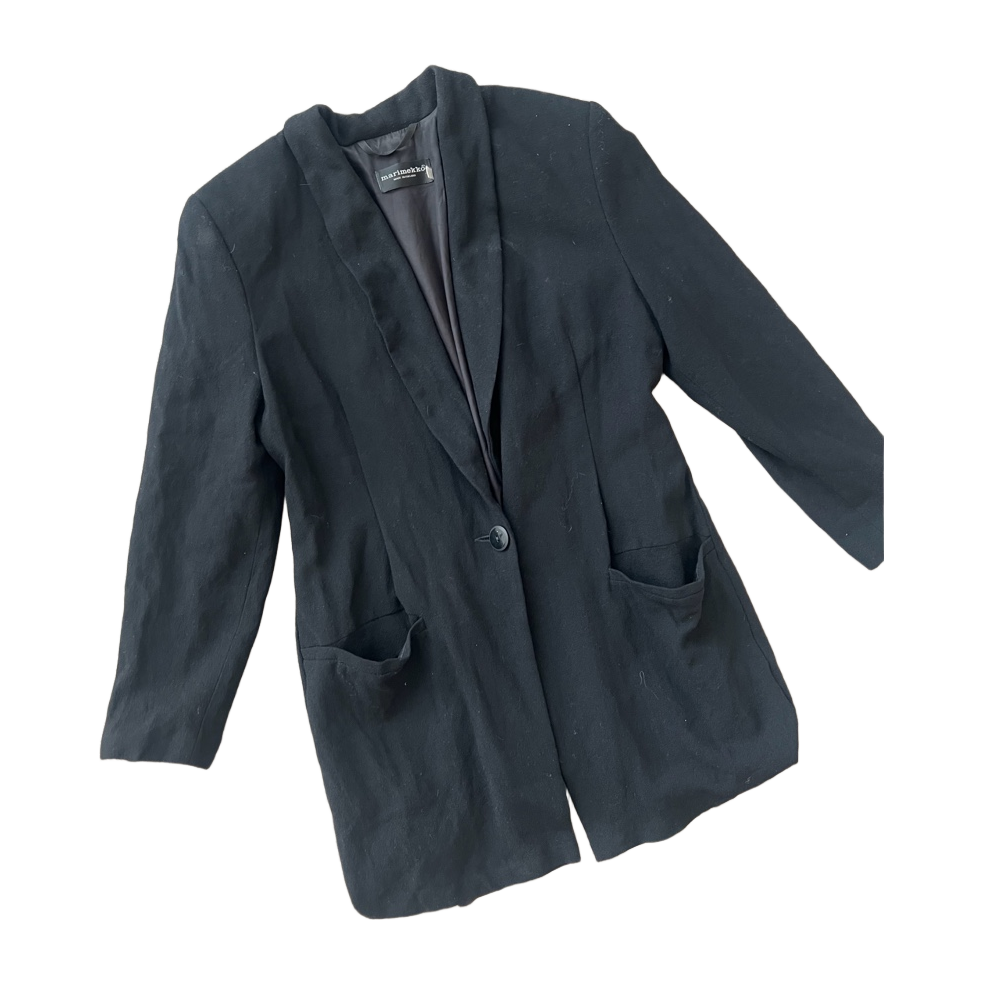 Marimekon Suomessa valmistettu bleiseri, villaa. Hyvä Vintage kunto. Koko 40, pituus 84cm ja kai kai mitta 54cm. Pitkä malli