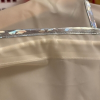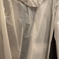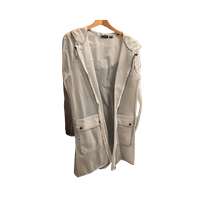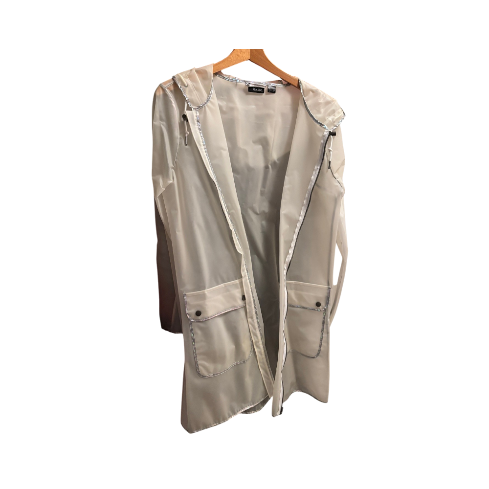 Valkoinen pitkä sadetakki, hopeiset reunat, hupullinen.