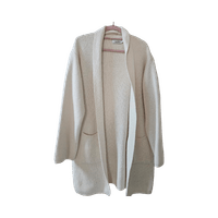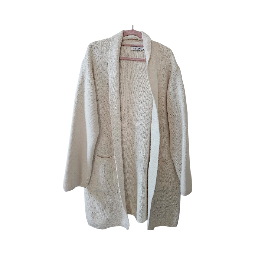 Vaalea pitkä neuletakki, tehty Italiassa, pehmeässä neuloksessa.