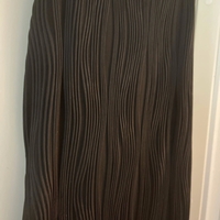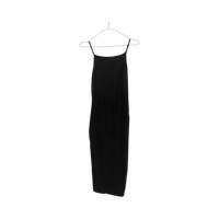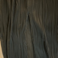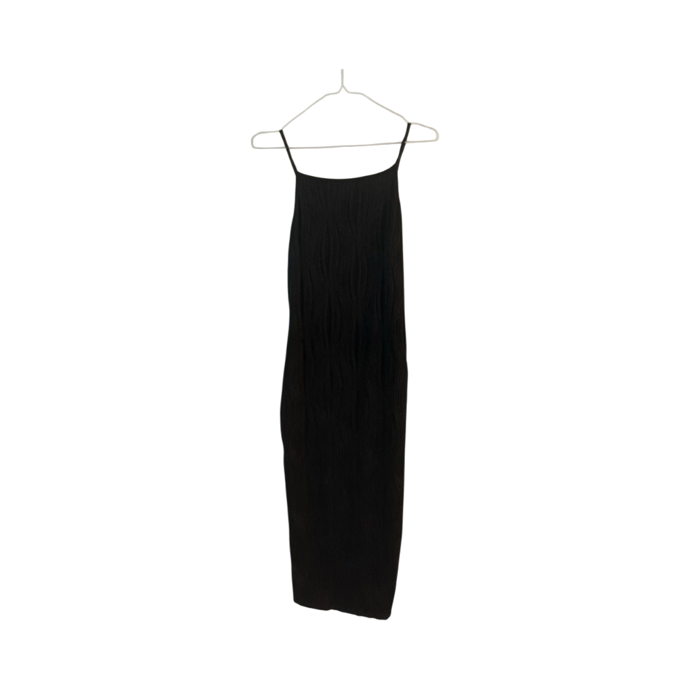 Pitkä, kapea musta plissee-mekko ohuilla olkaimilla. Halkio takana