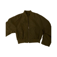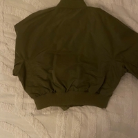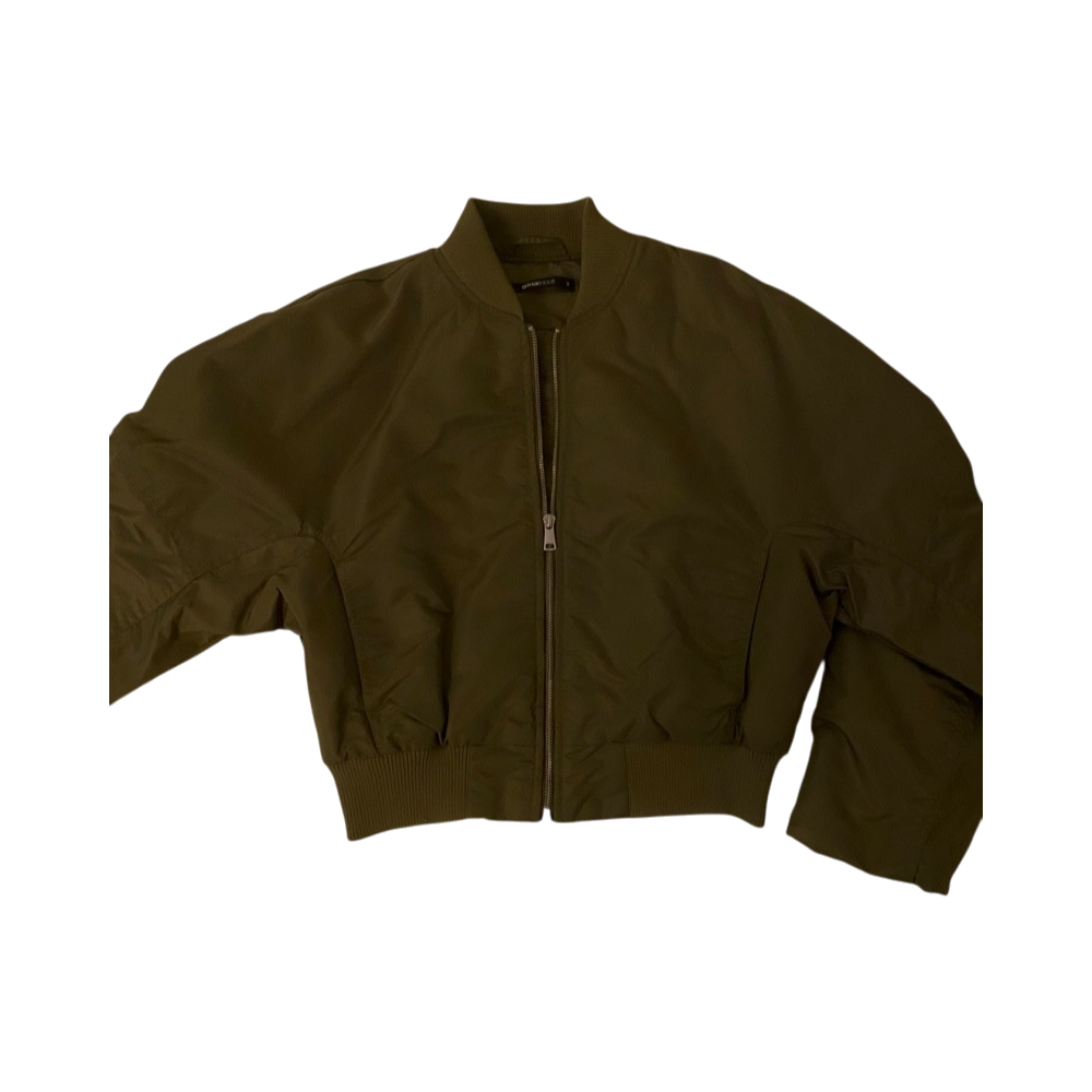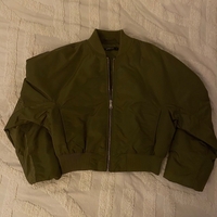 Lyhyt, vihreä bomber-takki, vetoketjulla ja joustovyötäröllä.