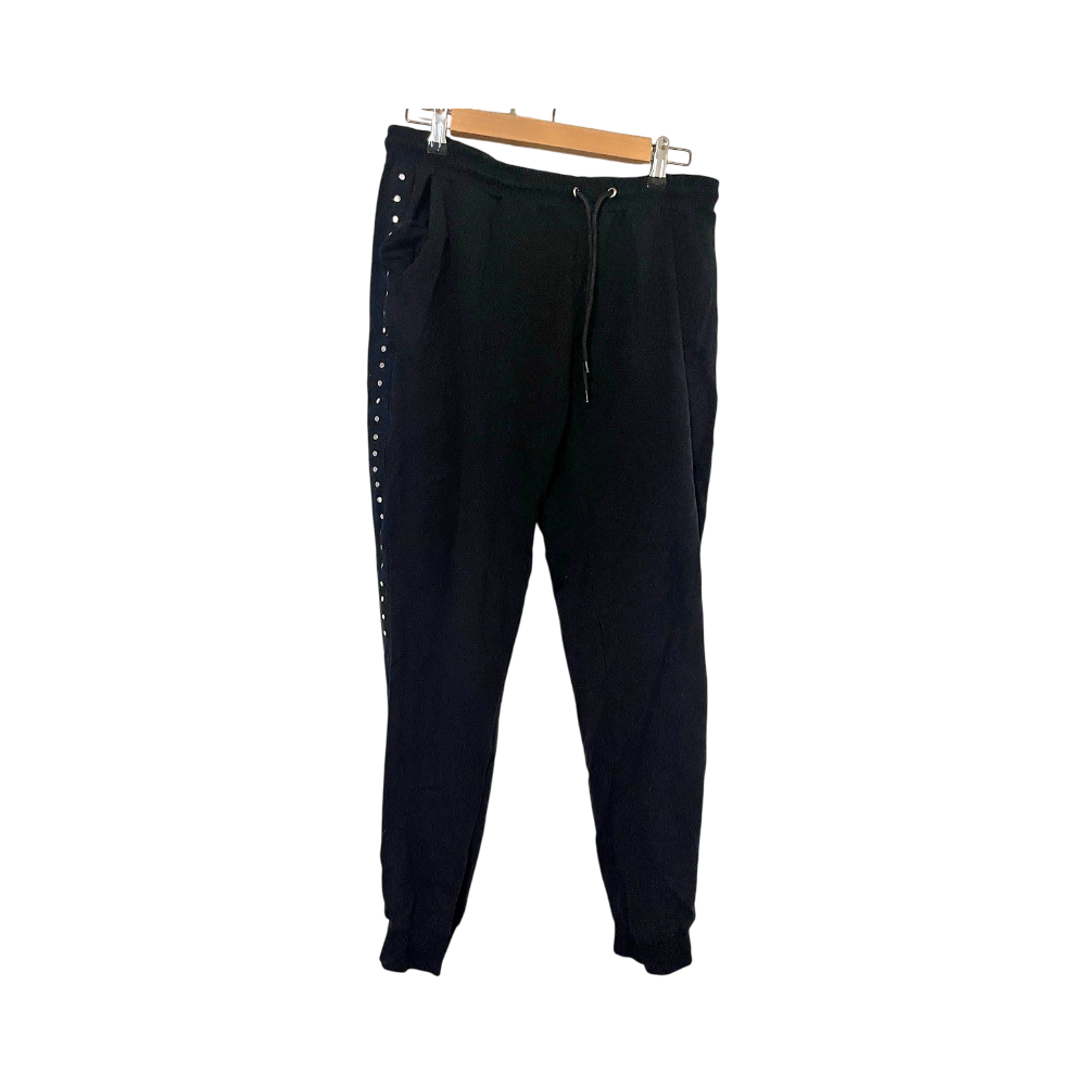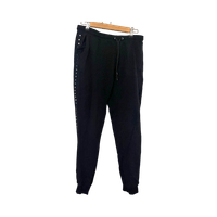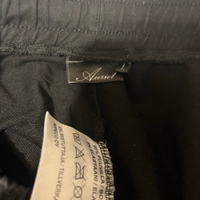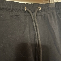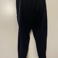 Mustat collegehousut. Sivuilla kivat yksityiskohdat. Vyötäröllä kiristysnauhat. Lahkeensuissa joustavat resorit. Edessä molemmin puolin taskut. Koko L. Vyötärön leveys n 40cm, haara-lahje n 73cm. Eläintalous MMM, lisätietoja saa kysymällä