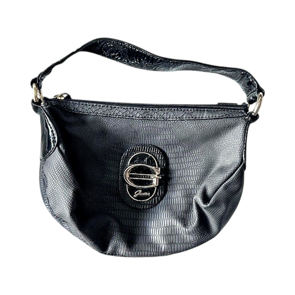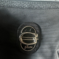 Guessin musta pieni käsilaukku. Siisti kunto, paitsi laukun takaosassa pientä kulumaa (viimeinen kuva).