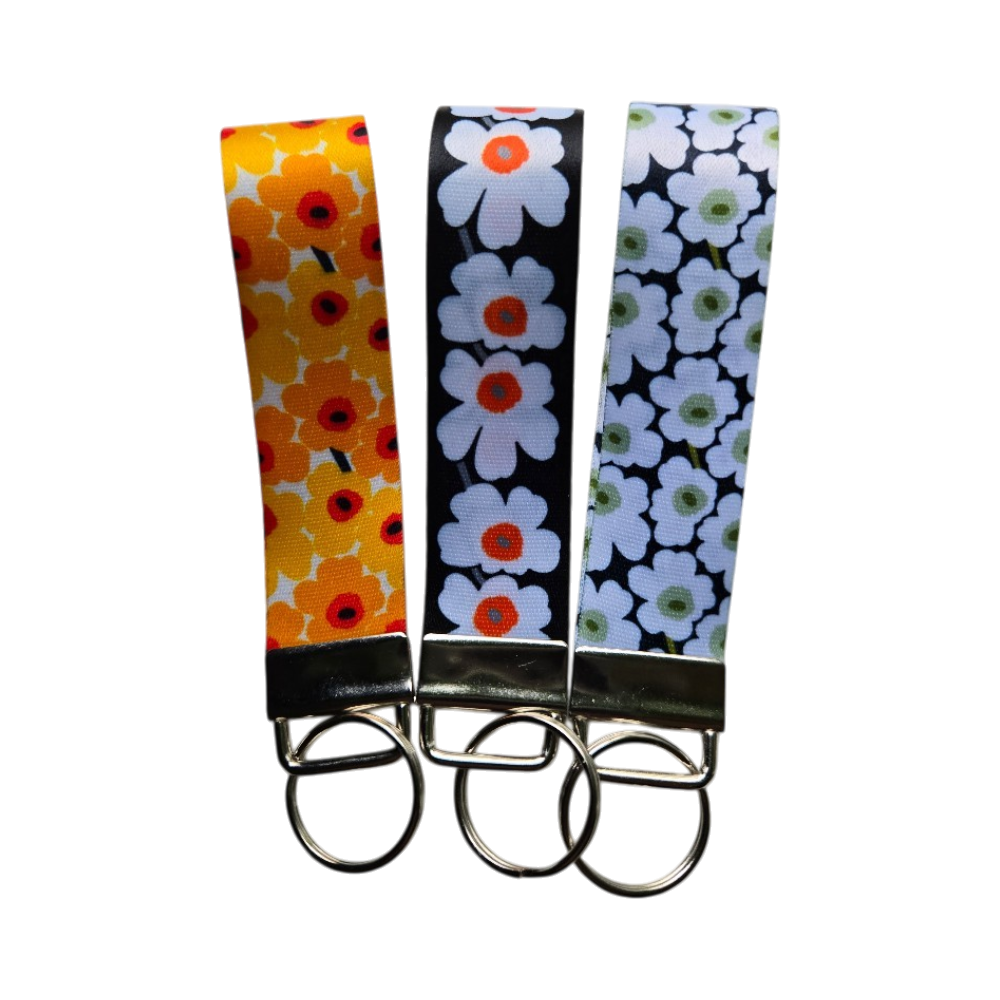 Kolme kukkakuosilla koristeltua avaimenperää/ laukkukoristetta vaikka lahjaksi. Uusia